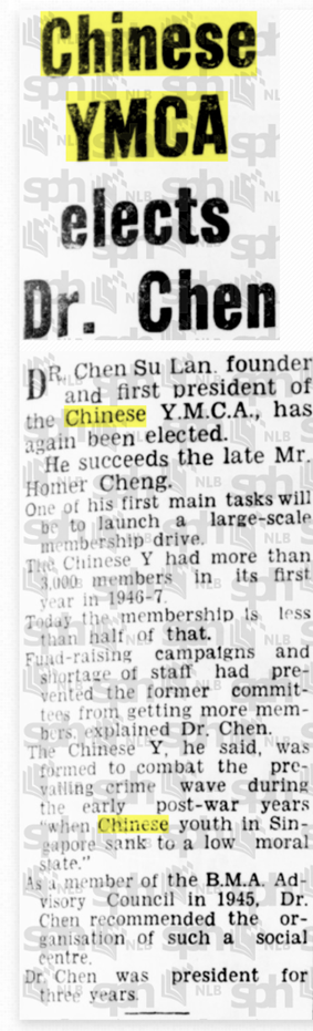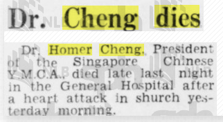 Mr Homer Cheng, President of the Chinese YMCA, died suddenly of a heart attack in the midst of raising funds for the Palmer Road building project.